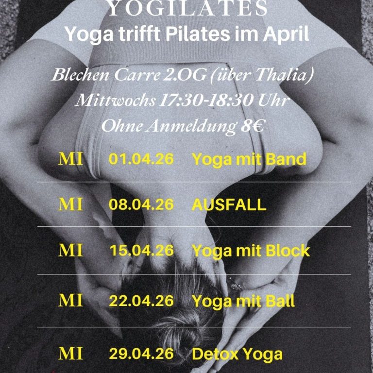 Im April erwartet dich im Blechen Carré eine besondere Kombination aus Yoga und Pilates. Beim Yogilates verbinden wir fließende Bewegungen mit gezielter Kräftigung – ideal für mehr Stabilität, Beweglichkeit und ein gutes Körpergefühl.